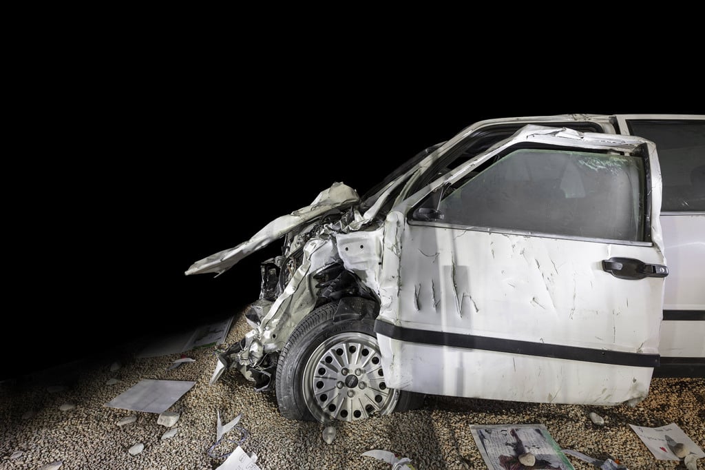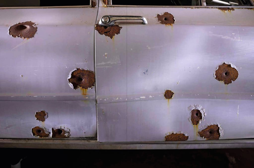 Mantovani ha usato il linguaggio che conosce meglio, quello della fotografia corporate, fatta di luci impeccabili, studiate per far risaltare la perfezione del design di un oggetto, e l’ha applicato a carcasse di veicoli e portiere trivellate da proiettili, curando con la massima attenzione anche le inquadrature. L’obiettivo era di replicare prospettive e punti di vista legati alle dinamiche dell’evento, per tentare di mostrare gli ultimi istanti di vita delle vittime. In questa lunga sequenza i reperti in still life assumono la forma di contenitori di una memoria tragica. Sono fantasmi trasformati in materia solida perché esigono di essere guardati, conosciuti e non dimenticati.