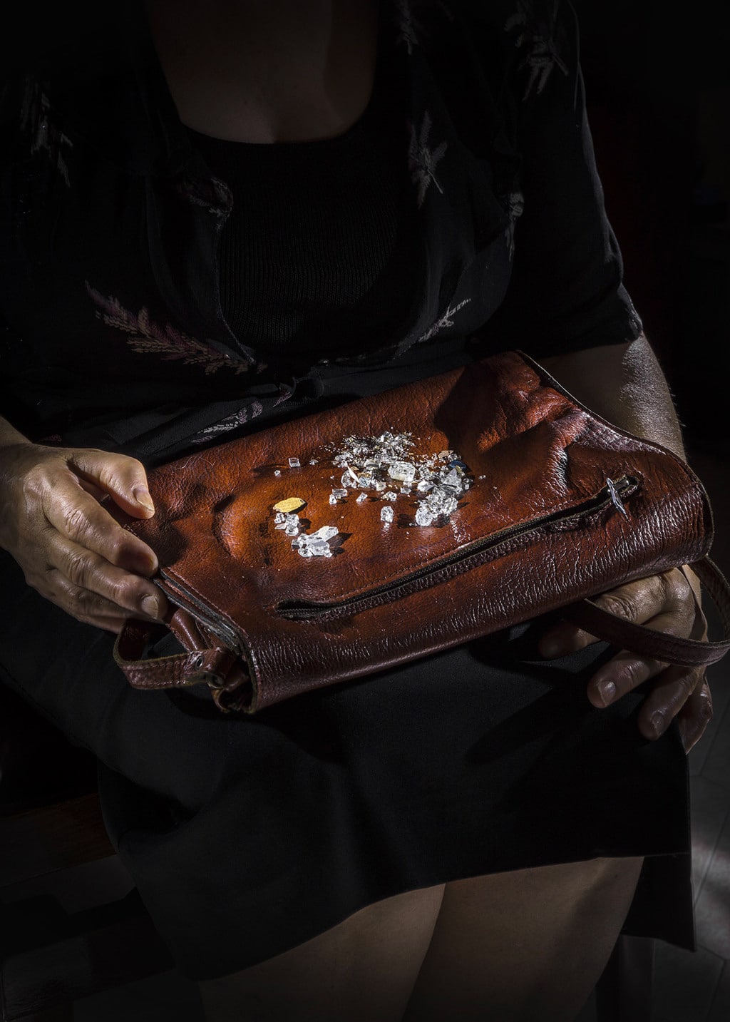 Unica eccezione è la foto in copertina, la prima nella gallery, in cui vediamo un essere umano, una donna. L’immagine è legata alla bomba sul rapido 904 Napoli-Milano, che esplose mentre il treno attraversava la grande galleria dell’Appennino, il 23 dicembre 1984, causando 16 morti e 267 feriti. Tra loro c’era Lina D’Aniello, che insieme a Mantovani ha ricreato gli attimi precedenti alla deflagrazione, indossando gli stessi vestiti e la stessa borsa su cui sono poggiati i piccoli frammenti di vetro che il corpo della donna ha restituito nei decenni successivi.