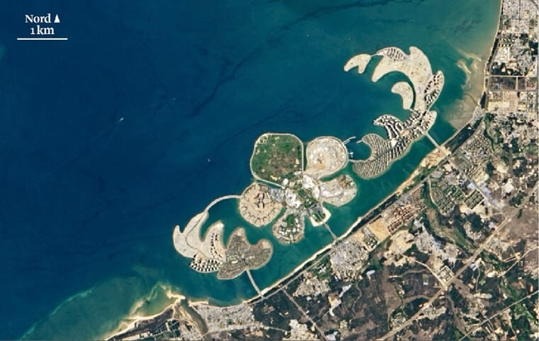 I satelliti della missione Landsat della Nasa avevano individuato i primi segni di costruzione nel 2012. Nell’immagine in alto, scattata due anni dopo, l’isola aveva ormai assunto la forma di un fiore. L’immagine in basso, scattata il 6 maggio 2020 dal satellite Landsat 8, mostra l’isola affiancata da altre due a forma di foglia, collegate a quella principale, nella fase finale dei lavori. L’apertura delle tre isole è prevista entro la fine del 2020. Ci saranno grattacieli con appartamenti, parchi, musei e altre infrastrutture.