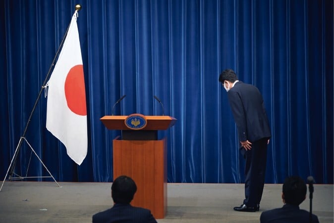 Il 28 agosto, durante una conferenza stampa, Abe ha spiegato che a giugno sono emersi segnali di un ritorno della colite ulcerosa di cui soffre fin da ragazzo. Di fronte alla necessità di gestire la crisi del covid-19, la decisione di Abe era inevitabile. La risposta del suo governo alla pandemia ha vissuto fasi alterne. Le mascherine in tessuto inviate per posta alle famiglie – soprannominate ironicamente sui social network Abenomask in riferimento alla Abenomics, la politica economica promossa dalla sua amministrazione – e il video pubblicato sul Twitter in cui il primo ministro si rilassa nella sua casa elegante mentre la popolazione viene invitata a non uscire per evitare i contagi, hanno suscitato forti critiche. Il bonus da 100mila yen (800 euro) promesso a tutti i cittadini è stato rinviato dopo alcune modifiche al piano originale.