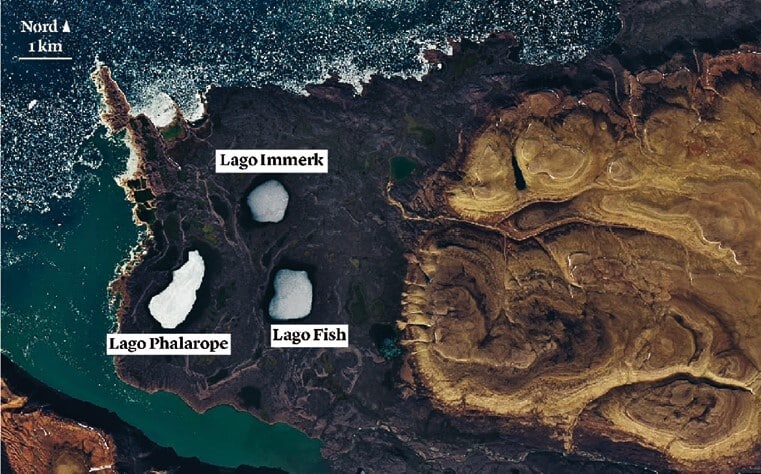 Le immagini a sinistra, scattate dal satellite Landsat 8 della Nasa, mostrano una parte dell’isola di Devon particolarmente ricca di piante delle specie Poa arctica e Poa abbreviata.–Adam Voiland (Nasa)