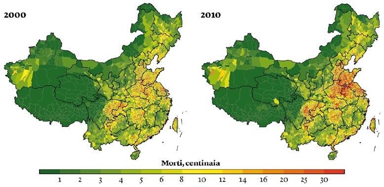 Inquinamento Secondo uno studio pubblicato sui Proceedings of the National Academy of Sciences, l’inquinamento atmosferico in Cina causa tra 1,5 e 2,2 milioni di vittime all’anno. I ricercatori hanno analizzato la concentrazione tra il 2000 e il 2016 delle polveri sottili PM2,5, oltre alle condizioni meteorologiche e altri parametri. Le aree più inquinate sono risultate quelle di Pechino e di Tianjin, e la parte meridionale della provincia dell’Hebei. Quelle meno inquinate sono invece la Mongolia Interna, il sudest del Tibet e l’ovest del Sichuan. Complessivamente le polveri sottili PM2,5 avrebbero causato più di 30 milioni di morti premature tra gli adulti.