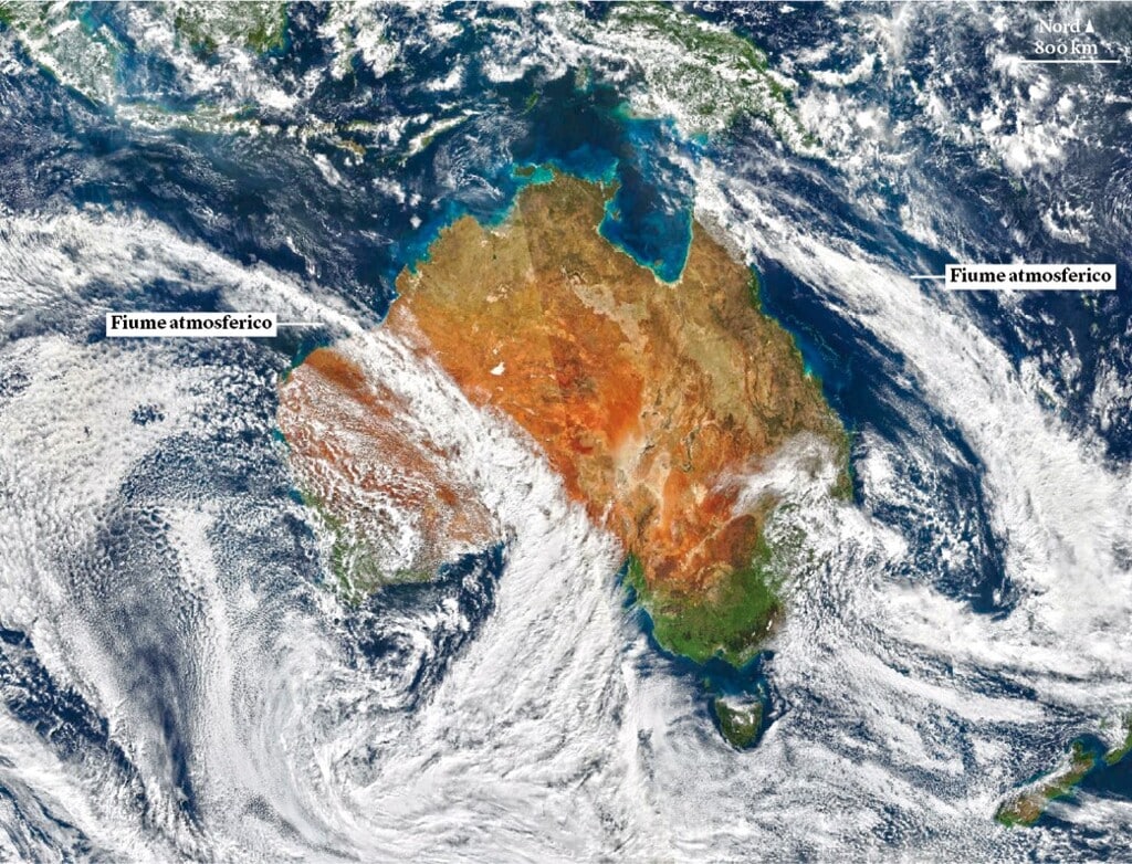 ◆ Il 10 agosto 2020 i meteorologi australiani hanno avvistato due grandi fasce di nuvole tra l’oceano Indiano orientale e l’oceano Pacifico sudoccidentale. Questi flussi di umidità, noti come fiumi atmosferici, hanno portato forti piogge su entrambi i lati dell’Australia. Si verificano in tutto il mondo e colpiscono regolarmente l’Australia, ma è raro che se ne vedano due contemporaneamente, spiegano i meteorologi.