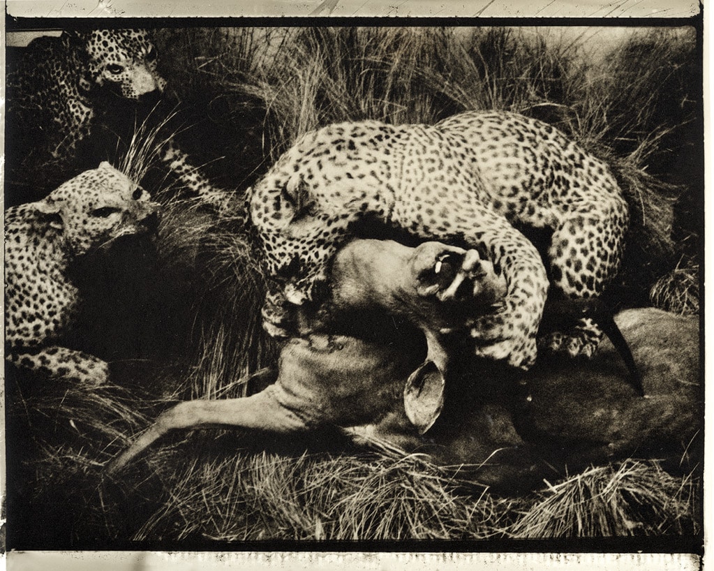 Tra gli animali fotografati ci sono gli uccelli: sono spesso solitari, come i fenicotteri che in un grigio delicato scandiscono l’inquadratura con i loro colli a forma di punto interrogativo; un pavone orgoglioso della sua ruota elegante; uccelli neri e spigolosi che volano sopra a un cartello con la scritta “Exit” andando chissà dove. E cani che corrono e saltano su una spiaggia. Più violenta e inattesa invece è la scena – risultato di una delle numerose visite dell’artista al museo di Storia naturale e della sua conoscenza dei diorami – che mostra dei leopardi impegnati a divorare un altro animale, un’antilope o un bufalo, non importa. Ciò che conta è che “la tassidermia somiglia alla fotografia. I bravi tassidermisti ricostruiscono un momento, altrimenti vedremmo solo un animale impagliato. Sono vite silenziose, ma rimangono comunque delle vite”. Il bestiario di Moon accoglie anche dei pachidermi, come l’elefante del circo Drurova e i rinoceronti, immobilizzati per l’eternità. È un’atmosfera sospesa, come in tante fotografie incorniciate da bordi fragili, dove si conservano piccoli elementi accidentali che gli restituiscono vita, e che sono al tempo stesso materia e tempo: “Mi piace che la fotografia sia vulnerabile, del resto le tracce presenti sulle Polaroid sono già segni del tempo e della decomposizione; in questo caso la minaccia appare già nell’inquadratura. Mi piace che l’immagine sia sfuggente, che sia solo l’ultimo istante del tempo che ho impiegato a farla. Quando ci riesco è quest’ultimo sguardo che mi interessa”, dice Moon. Nel percorso della mostra ci si può anche perdere nei vasti paesaggi. Paesaggi che respirano, che sono più impressioni di spazi che descrizioni precise. Paesaggi morbidi, sensuali, come l’insieme dell’opera di Moon, o in cui ci si può immergere quando è nevicato. Ci sono quelli da guardare a distanza per cogliere, per esempio, la dimensione scultorea dell’immensa roccia circondata dai flutti in Portogallo; o quelli a cui bisogna avvicinarsi, come quando la cascata mostra tutta la sua forza, le palme disegnano il cielo o nei porti, diventati spazi privilegiati di evasioni fotografiche, le ciminiere e le gru danno forma al grigiore. Il paesaggio può anche diventare il ritratto di un albero, così come dei fiori, a colori o in bianco e nero, possono diventare delle nature morte, delle sculture, o simboleggiare semplicemente il tempo che passa.