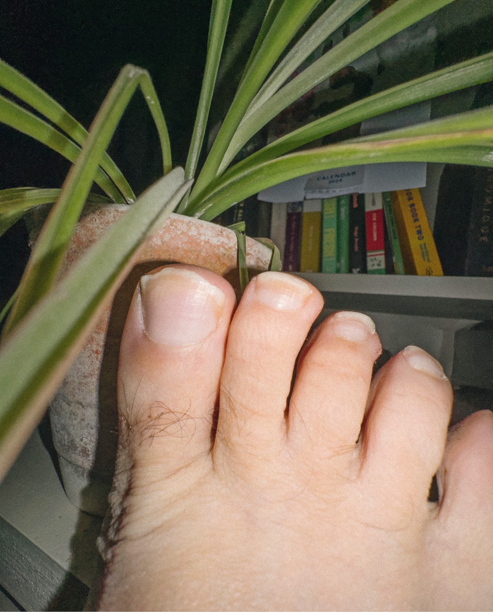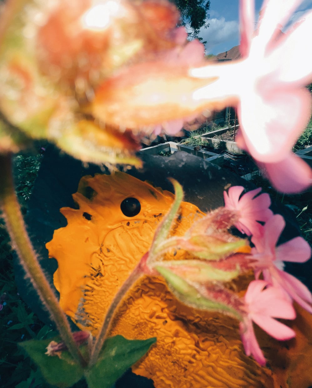 Con queste parole il britannico Mikael Buck presenta una serie di istantanee ironiche e a tratti surreali. Fiori, piante, insetti veri e pupazzi di plastica si susseguono senza un ordine preciso. Ogni tanto si scorgono le parti di un corpo: un piede, un polso, un volto nascosto che ritorna, ripreso con prospettive deformanti. Sono autoritratti che l’autore ha scattato tra il 2019 e il 2024, cercando di coprirsi per poi affiorare dietro a un muro o a una pianta. Le immagini possono essere lette come riflessioni sui tentativi falliti dell’artista di comprendere e correggere il passato attraverso la fotografia. Buck cerca sollievo o forse redenzione nelle foto scattate con il cellulare. A volte le modifica usando l’intelligenza artificiale generativa; altre volte sembrano sbavature in un discorso senza copione. Uno spazio per parlare di sé e del rapporto complicato con il padre. Un modo per chiedere scusa, ma a chi? Forse a se stesso, per l’incapacità di maneggiare un dolore antico eppure ancora presente.