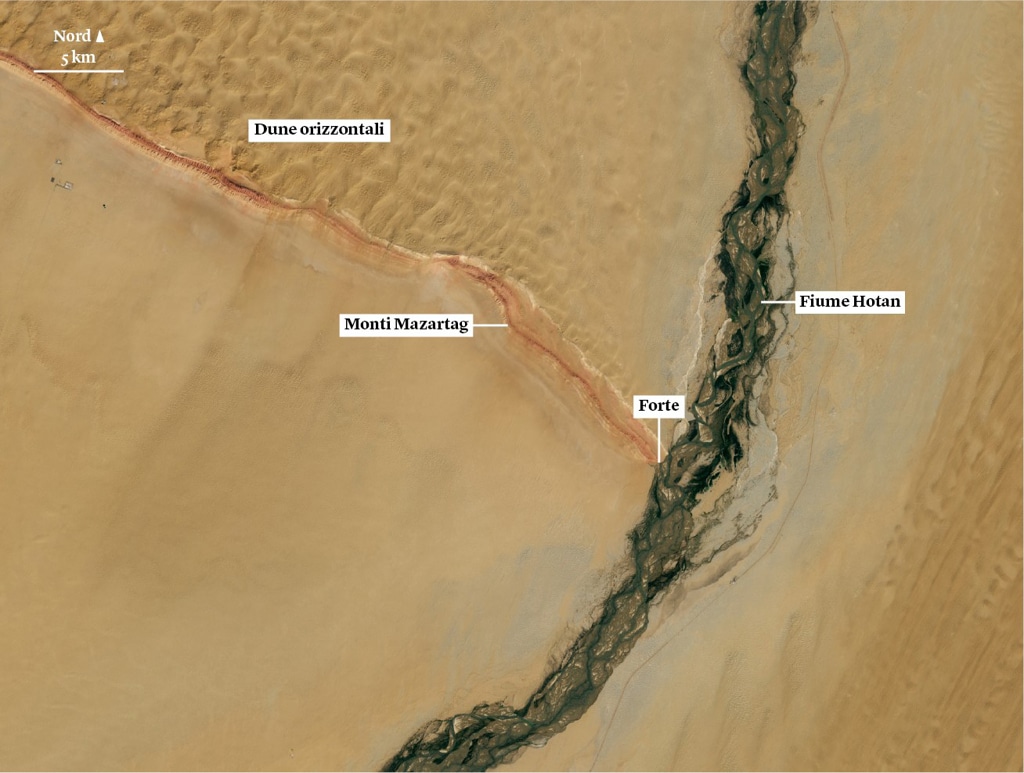 Questa immagine mostra il punto in cui la catena incontra il fiume Hotan, alimentato dallo scioglimento dei ghiacci sui monti Kunlun, a sud del bacino. Lo Hotan scorre per quasi trecento chilometri attraverso il deserto prima di sfociare nel fiume Tarim. Nel suo letto pioppi, tamerici ed erbe stagionali riescono a sopravvivere nonostante i periodi di siccità e la salinità del suolo.