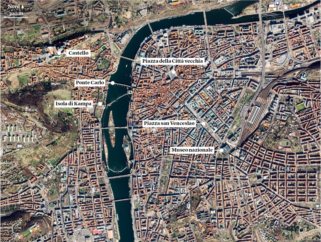 Sulla riva destra, a nordest del ponte Carlo, c’è la piazza della Città vecchia, il principale spazio pubblico di Praga, mentre più a sud la forma allungata di piazza San Venceslao si chiude con l’edificio neoclassico che ospita il Museo nazionale, vicino alla stazione centrale.–Nasa