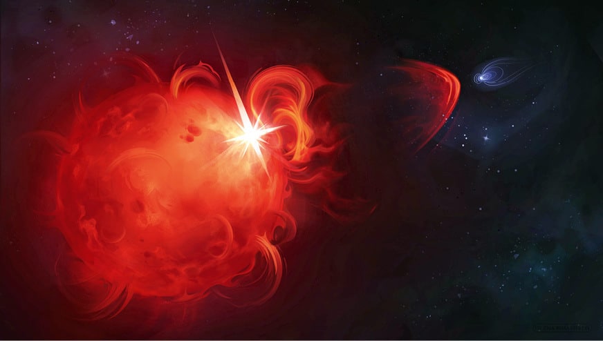 Il radiotelescopio europeo Lofar, nei Paesi Bassi, ha osservato l’espulsione di una nube di plasma magnetizzato da una stella nana rossa a 130 anni luce di distanza dalla Terra. Anche se dati indiretti avevano già suggerito che l’espulsione di massa coronale ( nell’immagine ) non è un’esclusiva del Sole, queste nuove prove pubblicate su Nature ne forniscono la prima conferma definitiva e sollevano interrogativi sull’impatto di questi eventi sull’abitabilità dei pianeti extrasolari.