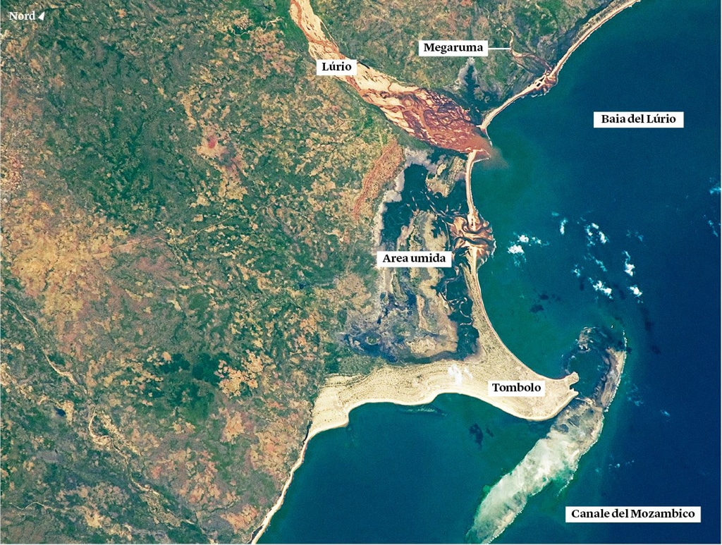 La sabbia proveniente dal Lúrio viene trasportata dalle correnti a sud e a nord della foce, formando le spiagge visibili nell’immagine. Nella parte bassa della foto la sabbia si è accumulata formando un istmo che si protende per quattro chilometri nel mare, collegando un’isola corallina alla terraferma. In geologia una struttura di questo tipo è chiamata tombolo.