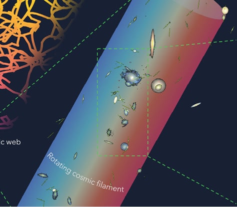 Astronomia È stato individuato un filamento cosmico (nell’immagine) composto da centinaia di galassie, largo centomila anni luce. È la struttura rotante più grande mai osservata, scrive Monthly Notices of the Royal Astronomical Society.