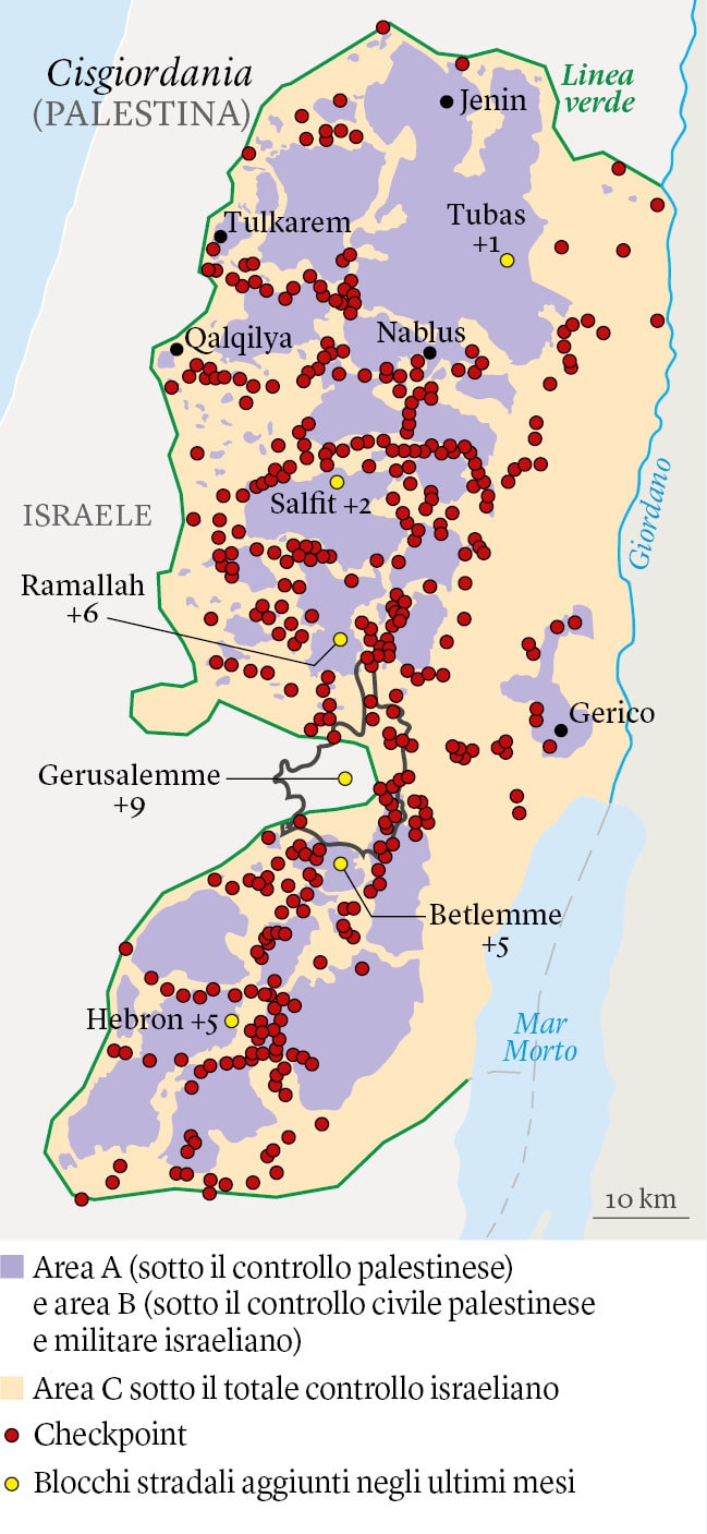 Secondo i documenti ufficiali e i dati dell’ufficio delle Nazioni Unite per il coordinamento degli affari umanitari (Ocha), ci sono 877 checkpoint e posti di blocco sparsi intorno alle enclave palestinesi della Cisgiordania (note come aree A e B). Circa un quarto (220) sono stati creati dopo l’ottobre 2023; tra febbraio e settembre di quest’anno ne sono stati allestiti 28. Un’indagine della Commissione palestinese per la resistenza al muro e agli insediamenti realizzata a settembre ne ha contati 911 totali, di cui ottanta costruiti dall’inizio del 2025. Questa leggera discrepanza indica la grande quantità dei blocchi, la loro diffusione e la facilità con cui sono allestiti, quindi il loro numero a volte dipende dal giorno.