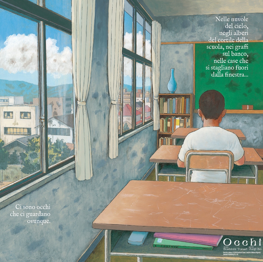 Ci voleva un concorso per scrittori horror in erba, vinto dalla giovane Soshichi Tonari, affinché un maestro del fumetto e dell’horror giapponese come Junji Ito, normalmente edito in bianco e nero, potesse finalmente cimentarsi con il colore, tendenzialmente bandito dai fumetti manga tranne che, a volte, in poche pagine d’apertura. Tuttavia il manga, nel fumetto, resta l’unico ambito prediletto dai giovani in cui, grazie al bianco e nero, il segno grafico è ancora dominante. Un grande autore come Moebius, fortemente colpito dalla sua potenza espressiva e onirica, portò in Francia Ito già negli anni novanta facendone pubblicare un racconto in un numero speciale della rivista À suivre, quando ancora il manga era un pianeta quasi sconosciuto. In questo caso siamo più sul libro illustrato che, come per tanti libri per l’infanzia delle edizioni Orecchio Acerbo qui segnalati, annulla i confini con il fumetto, quello con poco o nessun testo (in quest’ultima casistica rientra per esempio Arzach di Moebius). E qui, anche se il testo c’è, è più vero che mai, grazie anche al grande formato di questo cartonato. L’intensa colorazione a olio dell’autore su tavole che occupano quasi sempre le due pagine, fa di questi occhi e facce onnipresenti la perfetta rappresentazione del confine labile tra paranoia (un po’ lovecraftiana) e percezione ultrasensibile del reale (come quella di un artista), in questo caso infantile. Magistrale.