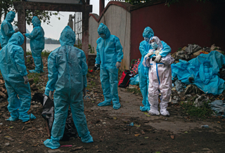 Una donna (in tuta protettiva bianca) guarda il corpo del marito, vittima del covid-19, nello stato nordorientale dell’Assam. L’India, con più di 5,1 milioni di casi positivi, è il secondo paese al mondo per contagi. Il numero dei morti, 83mila, è relativamente contenuto per un paese di 1,3 miliardi di abitanti e solleva molti dubbi sul modo in cui le autorità raccolgono i dati.