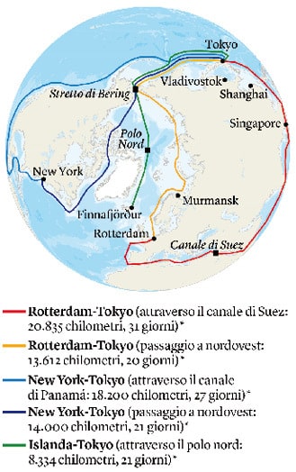 Vive il futuro in presa diretta. “È molto semplice”, dice stendendo con dimestichezza la mappa dell’Artico sul tavolo della mensa: “La distanza tra Rotterdam, il porto più trafficato d’Europa, e Yokohama in Giappone, è di 11.250 miglia nautiche passando dal canale di Suez. Scende a 7.350 miglia scegliendo la Northern sea route, lungo le coste artiche russe. Il Passaggio a nordovest, invece, anche se nella storia è stato il più sfidato nel tentativo di trovare la scorciatoia per l’Asia, è meno adatto alla navigazione commerciale, i tratti di mare tra le 36mila isole canadesi sono troppo stretti e le acque troppo basse. Comunque questo è il presente. Qui stiamo parlando d’altro”, dice puntando il dito al centro della mappa. Sembra voler accelerare lo scioglimento del polo nord con lo sguardo. “Questo porto nasce come terminal della via transpolare. Dal Pacifico del nord si passa lo stretto di Bering, quindi si raggiunge il polo nord, poi lo stretto di Fram e s’arriva proprio qui, la porta dell’Atlantico del nord. In totale sono 4.500 miglia nautiche. Evitare Suez e Panama navigando l’Artico significa evitare instabilità politiche, terrorismo, pirati. Ma la via transpolare, rispetto alla Northern sea route, fa risparmiare ancora più tempo, perché è molto più breve e le acque sono più profonde; inoltre si taglia fuori la Russia, con i suoi dazi, la sua arroganza e la sua burocrazia. Finnafjörður sarà la nuova Rotterdam”, dice il manager del baccalà prestato alla geopolitica.