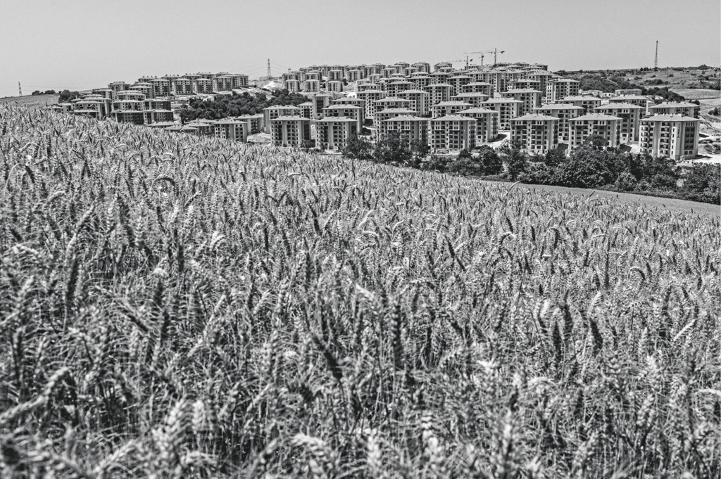Sull’altra collina invece la città è praticamente già completata. Lo skyline dei palazzi e delle gru s’intravede tra gli alti eucalipti, sembra un paesaggio prodotto con l’intelligenza artificiale. Ma è tutto vero, l’ho visto in volto questo mostro residenziale di quasi 14mila unità abitative costruito tra i pascoli, ufficialmente per la Turkish Airlines. Qui però il Qatar avrebbe comprato terreni per quasi trecento ettari, di cui quasi cinque direttamente acquistati dalla madre dell’emiro. Più a sud ho osservato da un’altura – poiché c’erano posti di blocco a ogni via d’accesso – i cantieri di un’altra new town a ridosso della diga di Sazlıdere, dove si estendeva la più vasta coltivazione di frumento del distretto. Il ministero dell’ambiente e dell’urbanizzazione ha autorizzato l’avvio dei lavori ad aprile e dopo due mesi c’erano 52 gru all’opera. Le colonne di polvere s’alzavano come da un campo di battaglia.