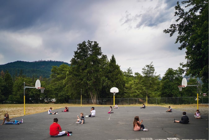 A mezzogiorno, quando la campanella suona la fine della sesta ora, le porte delle aule si aprono per un’ultima volta e i ragazzi escono. Corrono per i corridoi, dove la gran parte delle finestre non può essere aperta. Una volta in cortile si tolgono le mascherine e formano una lunga fila per uscire dal cancello. L’atmosfera è rilassata, questo giorno di scuola è finito, è estate.