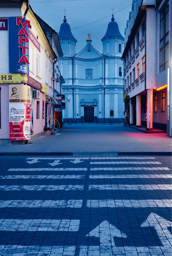 Ho scoperto che Ivano-Frankivsk è un bel posto, una città che non somiglia affatto alla fatiscente rovina urbana che mi ero immaginato. Giusto pochi minuti prima del nostro arrivo le nubi si erano aperte, e sotto il sole, con la gente che camminava per le strade e le piazze, sono rimasto colpito da com’era pulita e ordinata, non un posto arretrato di provincia rimasto fermo nel passato, ma una cittadina contemporanea con librerie, teatri, ristoranti e una piacevole miscela di architettura nuova e antica: quella antica incarnata nei palazzi e nelle chiese del settecento e dell’ottocento costruiti dai fondatori polacchi e dagli Asburgo conquistatori.