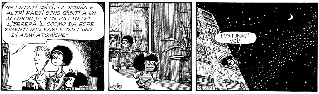 Condividi Stampa Copia link Email Facebook X Telegram LinkedIn Whatsapp Whatsapp Reddit Look up! (Peter Kuper, Stati Uniti) Buni (Ryan Pagelow, Stati Uniti) Peanuts, 1960 (Charles M. Schulz, Stati Uniti) Mafalda, 1964 (Quino, Argentina)