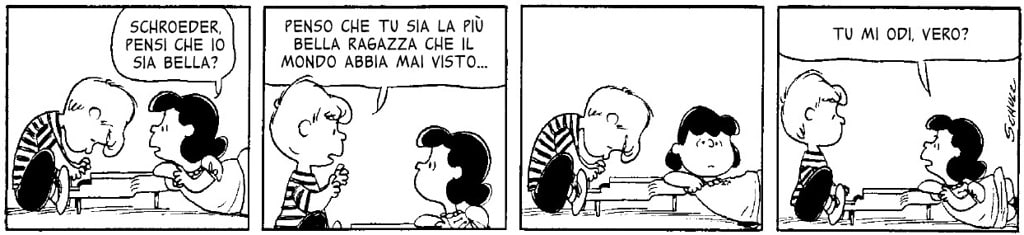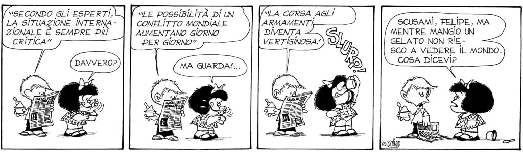Condividi Stampa Copia link Email Facebook X Telegram LinkedIn Whatsapp Whatsapp Reddit Look up! (Peter Kuper, Stati Uniti) Buni (Ryan Pagelow, Stati Uniti) Peanuts, 1960 (Charles M. Schulz, Stati Uniti) Mafalda, 1964 (Quino, Argentina)