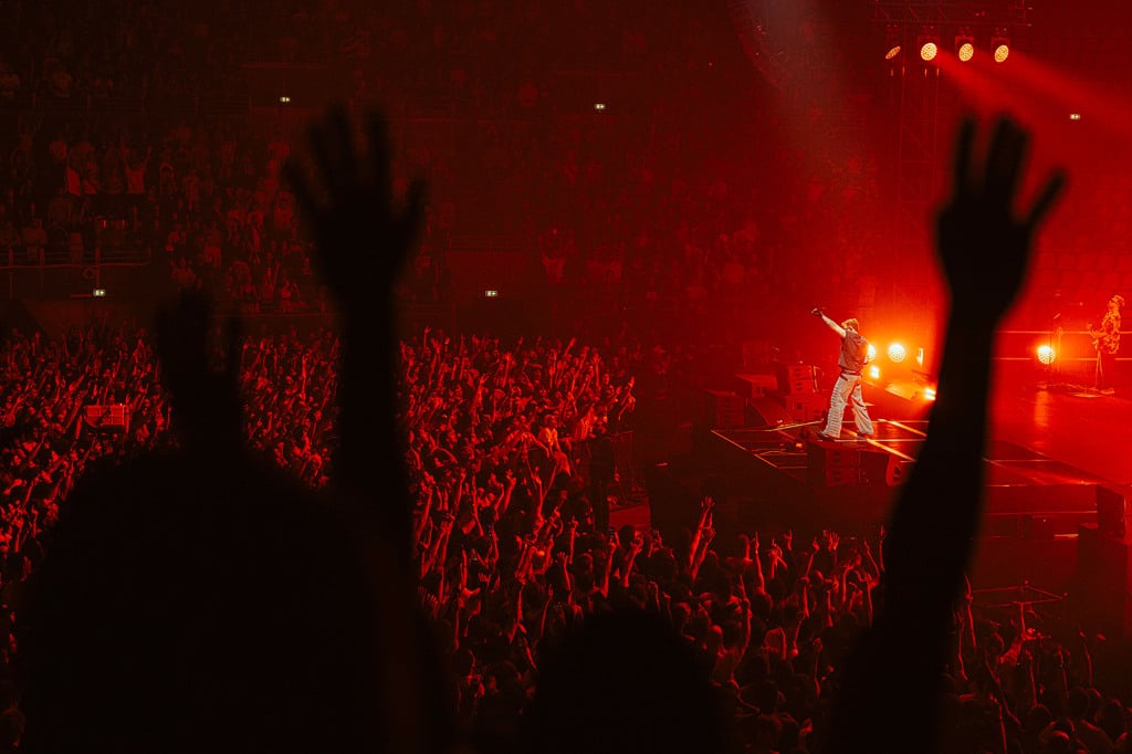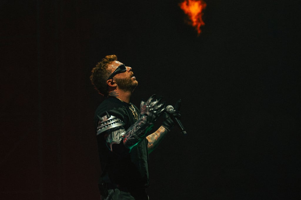 A metà concerto, tra il pubblico si scatena il mosh pit: gli spettatori formano dei cerchi e poi si lanciano gli uni contro gli altri durante brani come Hellvisback 2. Il rap di Salmo è costruito ossessivamente attorno a lui, alla sua storia, ma ogni tanto si concede lampi di critica sociale, come nel pop elettronico di 90min, che recita “Prima di essere un vero italiano, cerca di essere umano”, mentre sui megaschermi scorrono immagini di Giorgia Meloni, Matteo Salvini, Sergio Mattarella e Silvio Berlusconi. Il mosh pit si ripete perfino nella cover di Zucchero Diavolo in me, mentre la chiusura della prima parte dello show è affidata alla ballata un po’ scontata Il cielo nella stanza.