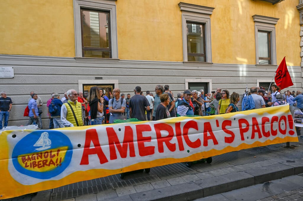 I manifestanti lo hanno invaso anche perché è una delle strutture coinvolte nell’organizzazione della Coppa America. Il decreto legge 96 del 2025, sulle “disposizioni urgenti per l’organizzazione e lo svolgimento di grandi eventi sportivi”, ha infatti prorogato in vista della gara la permanenza della struttura sulla spiaggia, che invece secondo il programma di risanamento ambientale e di rigenerazione urbana (Praru) andrebbe destinata a un uso pubblico e gratuito, senza cancelli o ingressi a pagamento per l’accesso al mare: “Sport sano e gratuito, mare libero per tutti e non ristoranti e bar panoramici per chi paga una tessera!”, urla una giovane manifestante tra gli applausi.