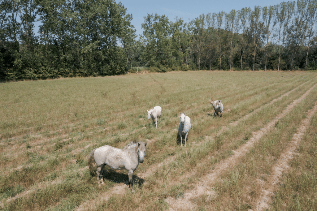 “Il territorio lavora come un organismo: ogni parte è interdipendente, ogni scelta agricola tiene conto delle dinamiche ecologiche circostanti”. Così, tra un campo di riso e un boschetto di pioppi, lo sguardo incontra stagni popolati di rane, siepi fitte di passeri, e distese d’erba dove si muovono liberi i cavalli bianchi.