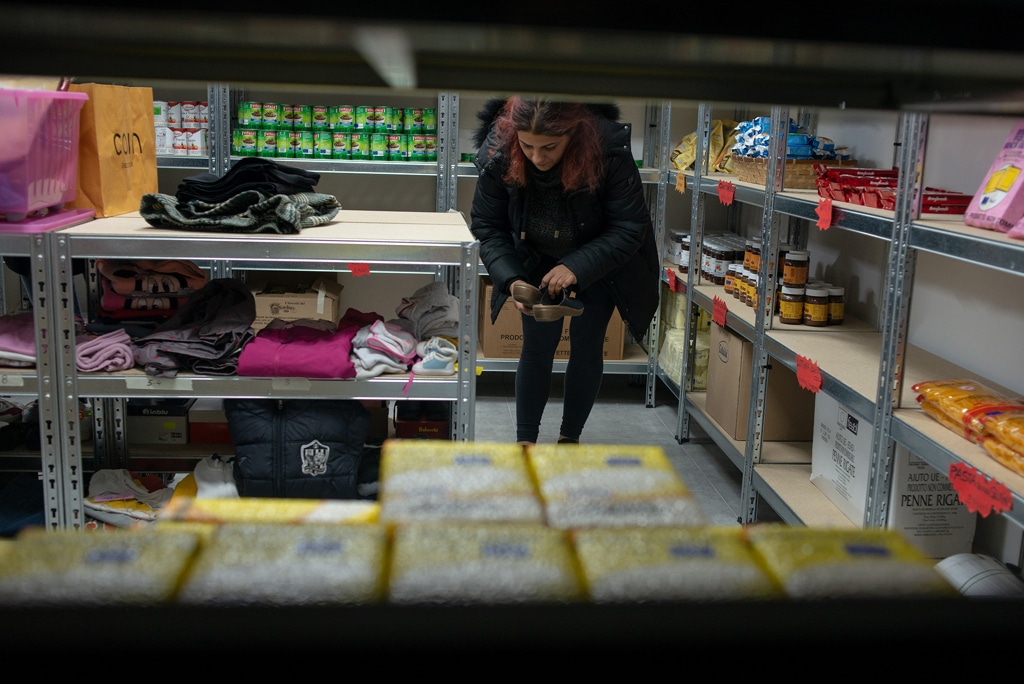 “Allo sportello aiutiamo ottanta famiglie di Bastogi nelle questioni che riguardano i sussidi e la casa”, spiega Samyra Musleh dell’associazione Nonna Roma. Nel residence l’associazione, attiva in tutta la città, ha un emporio (un social market) aperto tre volte alla settimana, in cui si accede con una tessera a punti. “Si hanno a disposizione cento punti al mese che le persone possono scegliere di consumare, scegliendo quali provviste mettere nel carrello: dalla pasta al latte. Ci sembra un metodo più rispettoso in confronto ai pacchi già preparati”, spiega Musleh. L’emporio è finanziato dai fondi europei e fa parte della rete del banco alimentare. Possono accedervi i nuclei familiari che hanno un reddito più basso di una soglia stabilita o che sono beneficiari di servizi sociali.